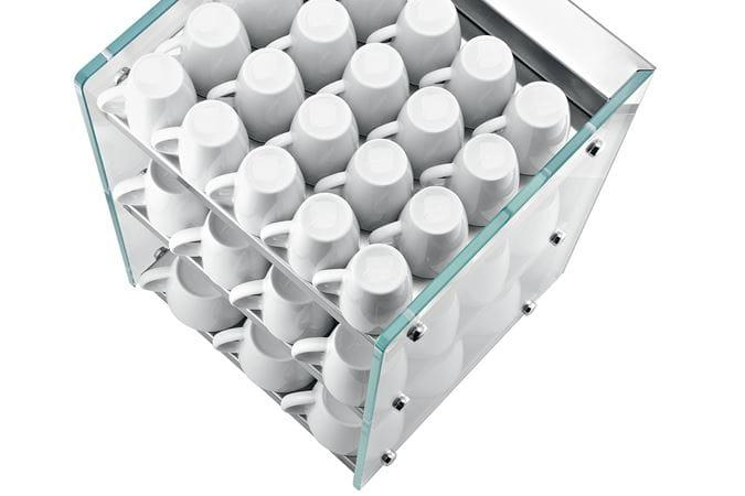 Avec son langage des formes aérien, le chauffe-tasses en inox avec ses éléments en verre blanc haute qualité fait sensation à côté de tous les modèles GIGA Professional et X8/X6.