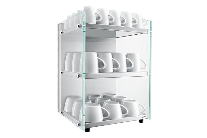 Ses trois surfaces de rangement peuvent accueillir un total de 100 tasses à espresso (Ø 60 mm) ou 60 tasses à café (Ø 80 mm). Ses trois résistances de surface modernes offrent une grande efficacité énergétique et fonctionnent en silence, ce qui le rend particulièrement adapté à une utilisation dans des bureaux.